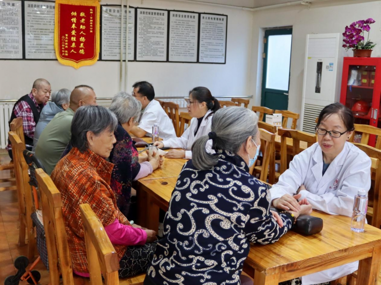 荣誉证书颁发完毕后,义诊环节随即有序展开。由医院资深专家于铜、韩丽红、曹文胜等主任领衔的医护团队迅速到位。在活动大厅临时设置的诊疗区域内,耐心接待每一位前来咨询的老人。通过测量血压、搭脉问诊、观察舌苔等,细致地查看老人的身体状况,耐心地解答老人们的健康疑问。同时,助理老师们穿梭在老人中间,脸上洋溢着亲切的笑容,主动拉起老人的手与他们互动聊天。